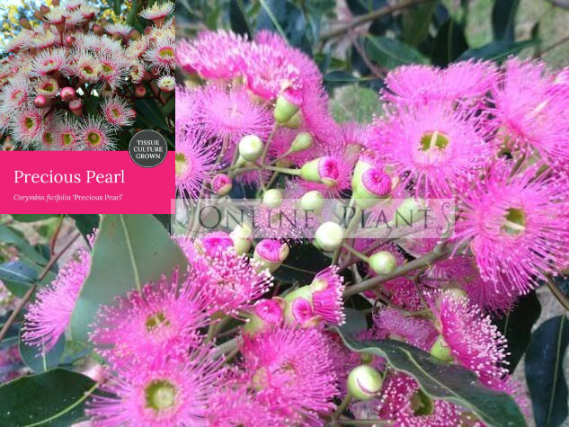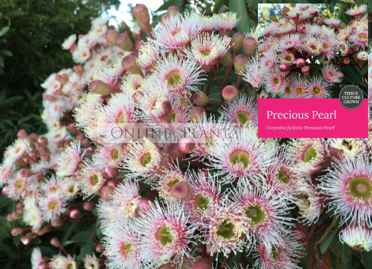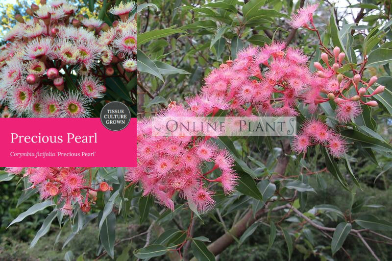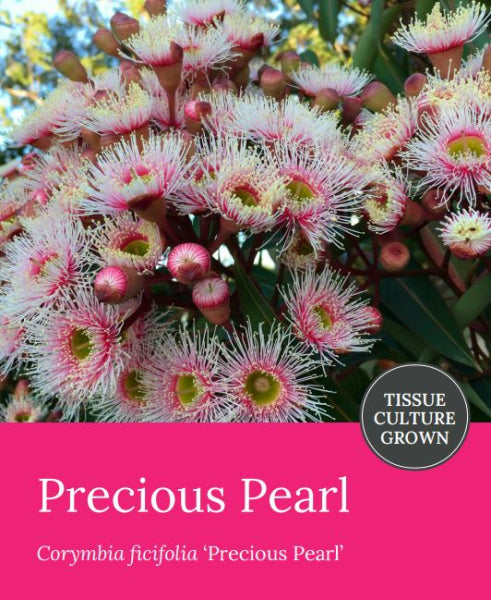 Corymbia ficifolia ‘Precious Pearl’ is a compact flowering gum renowned for its profuse pale pink blossoms, blooming in mid to late summer. This striking small tree has a rounded crown, dark green foliage, and attractive, rough bark. Its showy flowers attract birds, bees, and butterflies, making it ideal for wildlife-friendly gardens across many parts of Australia.